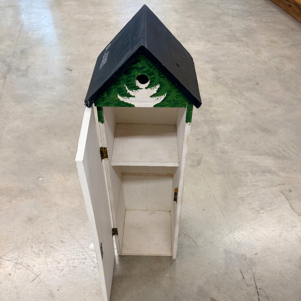 Unique hand painted house with shelves inside. Perfect for trinkets and treasures.