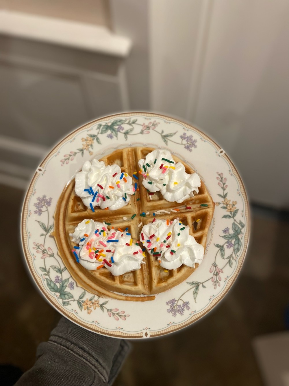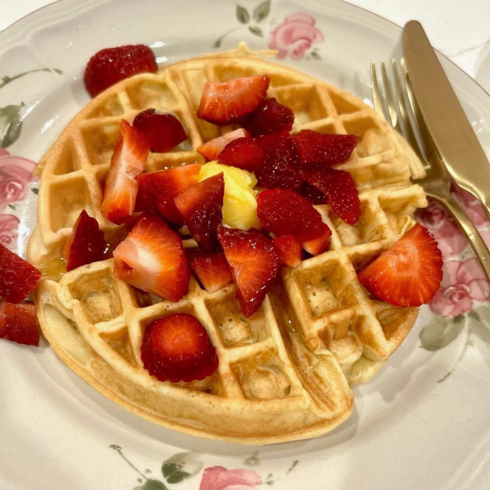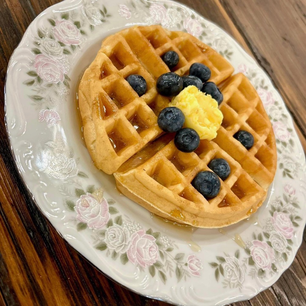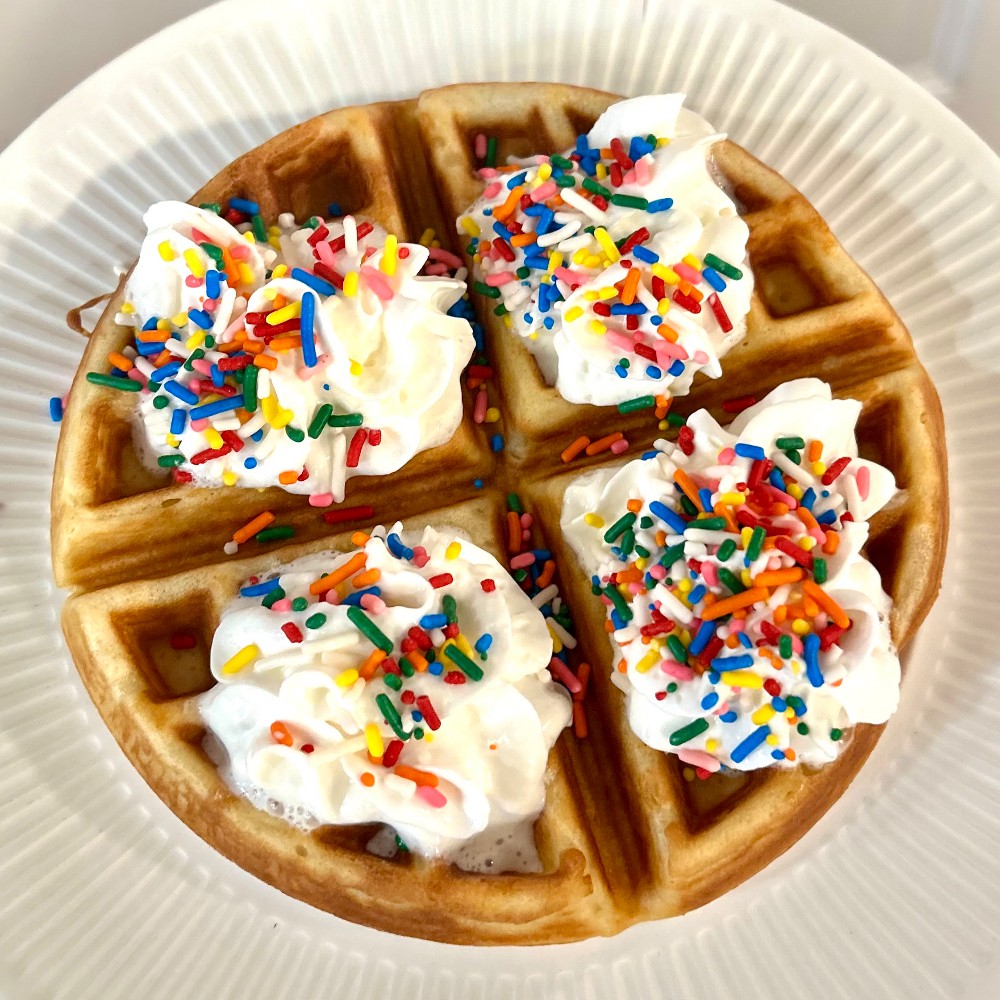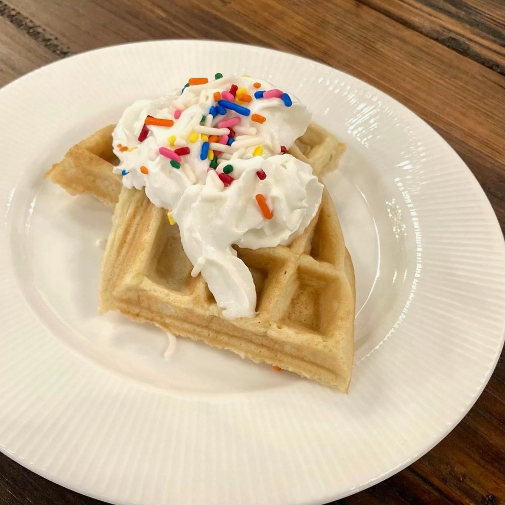 Homemade Belgian waffle with your choice of toppings - strawberries, blueberries, bananas, pecans, chocolate chips, rainbow sprinkles, whipped cream, butter, and maple syrup.