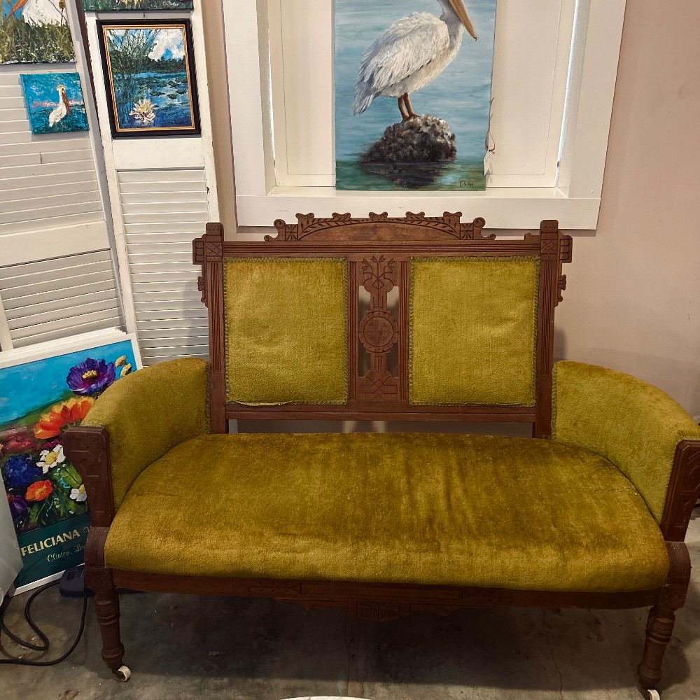 Option 1 - Beautiful vintage wooden settee with carved details and rich green upholstery. Solid wood frame with ornate craftsmanship and a comfortable padded seat and back. Great statement piece for an entryway, bedroom, living room, or studio. Sturdy and full of character.