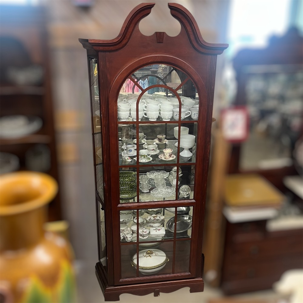 Wood curio cabinet and glass doors. Features multiple interior glass shows for displaying dishes, collect pools or decor with a traditional arched top design.