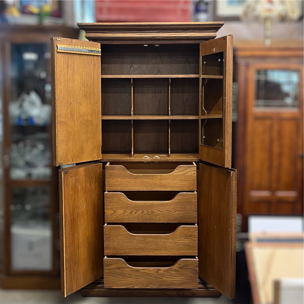 Option 1 - wooden, gold handles, 6 small inner shelves, 1 larger inner shelf, 4 inner drawers, dimensions - 39.5"w x 76.5"h x 21.5"d