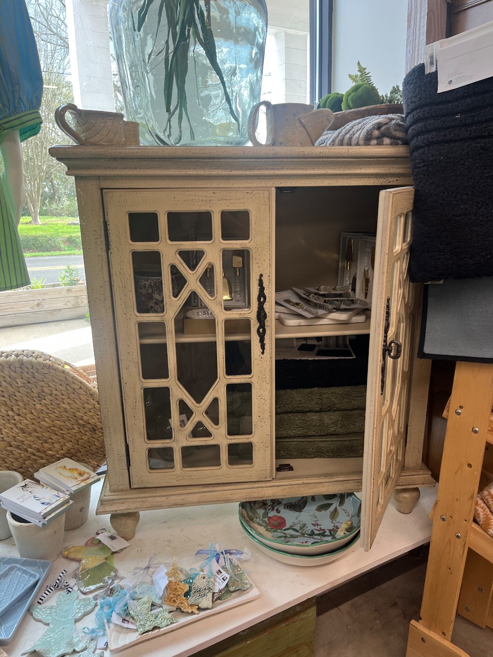 Option 2 - painted off-white, short, glass in doors, could be used as nightstand, dimensions: 36"w x 39"h x 18"d