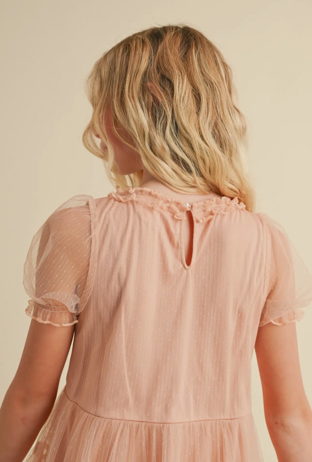 The sweetest peach dress tiered with dotted tulle. Key hold back and flared silhouette make it the perfect choice for your girl.