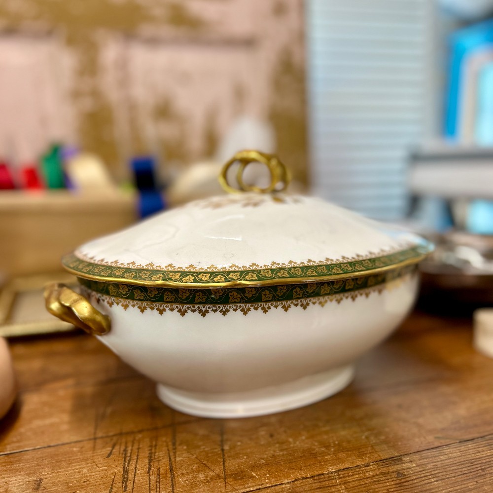 This serving dish, known for its high quality and intricate designs, originates from Limoges, France. It was manufactured by Charles Field Haviland, and is from around the late 19th-early 20th century.
